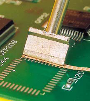 使用Metcal的扁铲形烙铁头和吸锡编织带可以清理两面和四面引脚芯片的焊盘,方便、快捷并且非常安全。在清理焊盘时请特别注意,不要用烙铁头和吸锡带在焊盘来回拖动,这样会造成焊盘脱落。